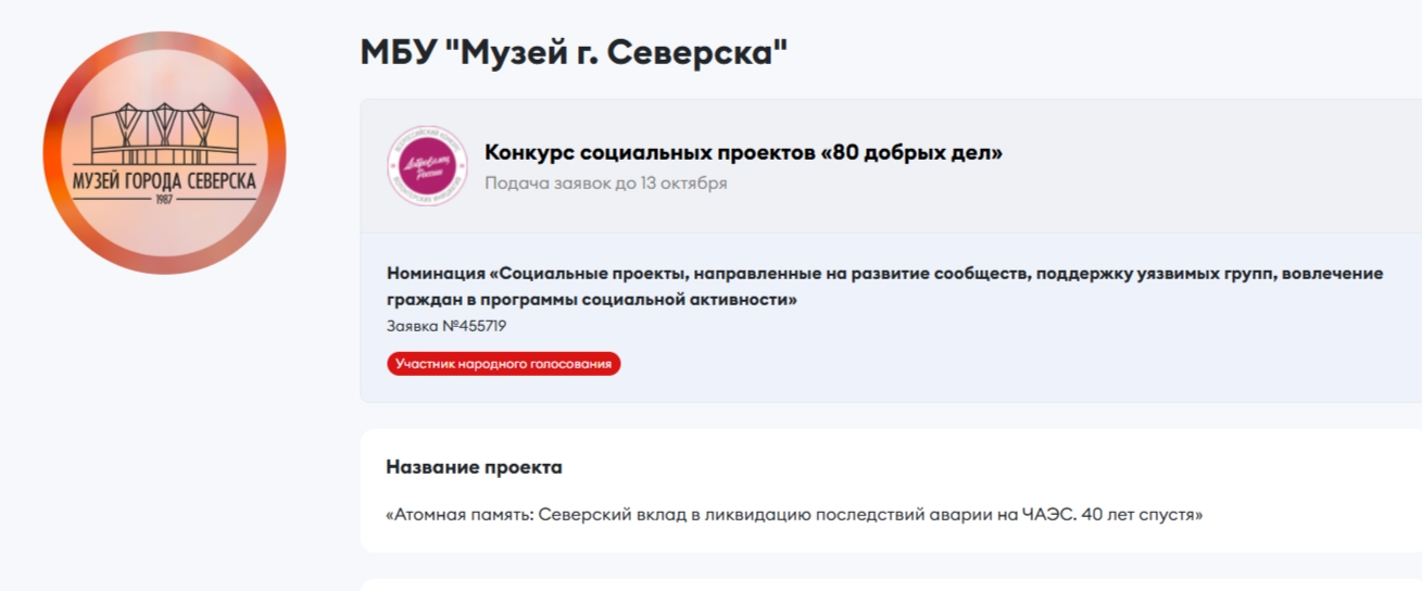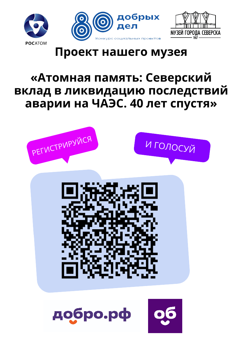 Просим поддержать проект нашего музея «Атомная память: Северский вклад в ликвидацию последствий аварии на ЧАЭС. 40 лет спустя». Проект участвует в Конкурсе социальных проектов "80 добрых дел" Госкорпорации "Росатом"! Мы уже прошли несколько этапов, и сейчас - участники этапа народного голосования. В случае победы - в год 40-летия ликвидации последствий аварии на ЧАЭС в музее будет организована выставка совместно с ГОО "Союз Чернобыль" и АО "СХК" и проведен ряд тематических мероприятий для северчан.