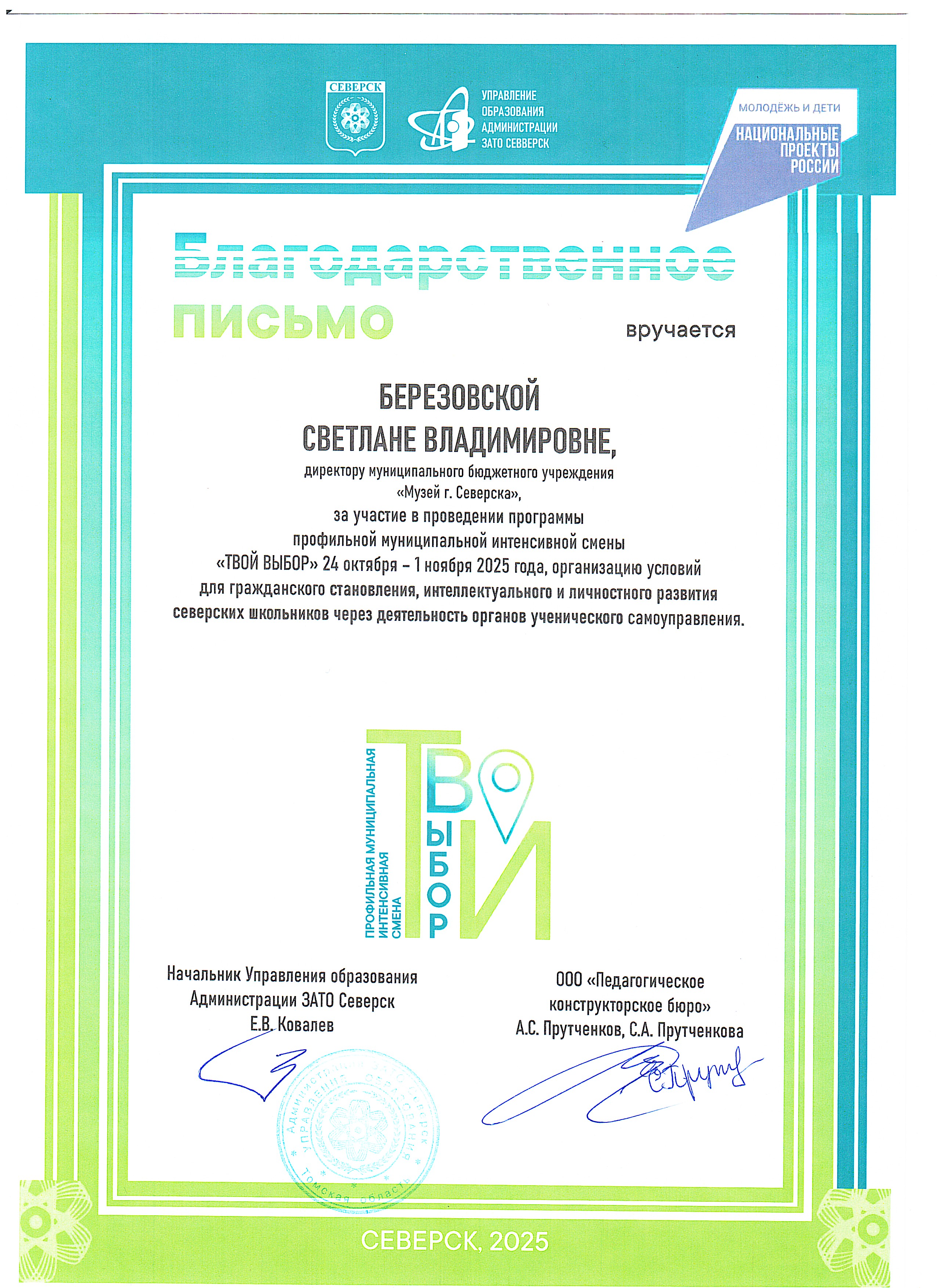 Светлана Владимировна получила Благодарственное письмо за участие в проведении программы профильной муниципальной интенсивной смены «Твой выбор».